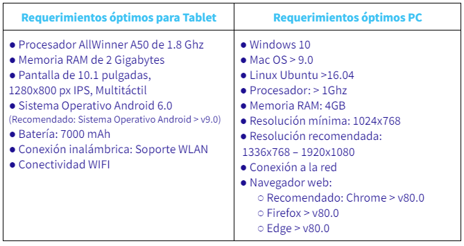 En primer lugar, cabe recordar que a la hora de la utilización de la plataforma de ¡Me gusta Matemática!, se deben cumplir una serie de requerimientos técnicos para cada uno de los dispositivos.